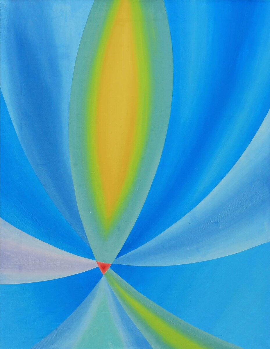 В этой картине исследуется взаимодействие цвета и геометрии. Она представляет собой гармоничное сочетание синих, зеленых и желтых оттенков, создающее динамичный визуальный поток, который указывает на движение и энергию, однако при этом плавные переходы и градиенты вызывают ощущение спокойствия и равновесия. Картина имеет центральный фокус, который направляет взгляд зрителя по холсту. Сопоставление мягких и резких цветов и линий демонстрирует универсальность художника. Яркие цвета и геометрическая точность делают картину визуально впечатляющей, вовлекая зрителя в исследование абстрактных форм и теории цвета.
