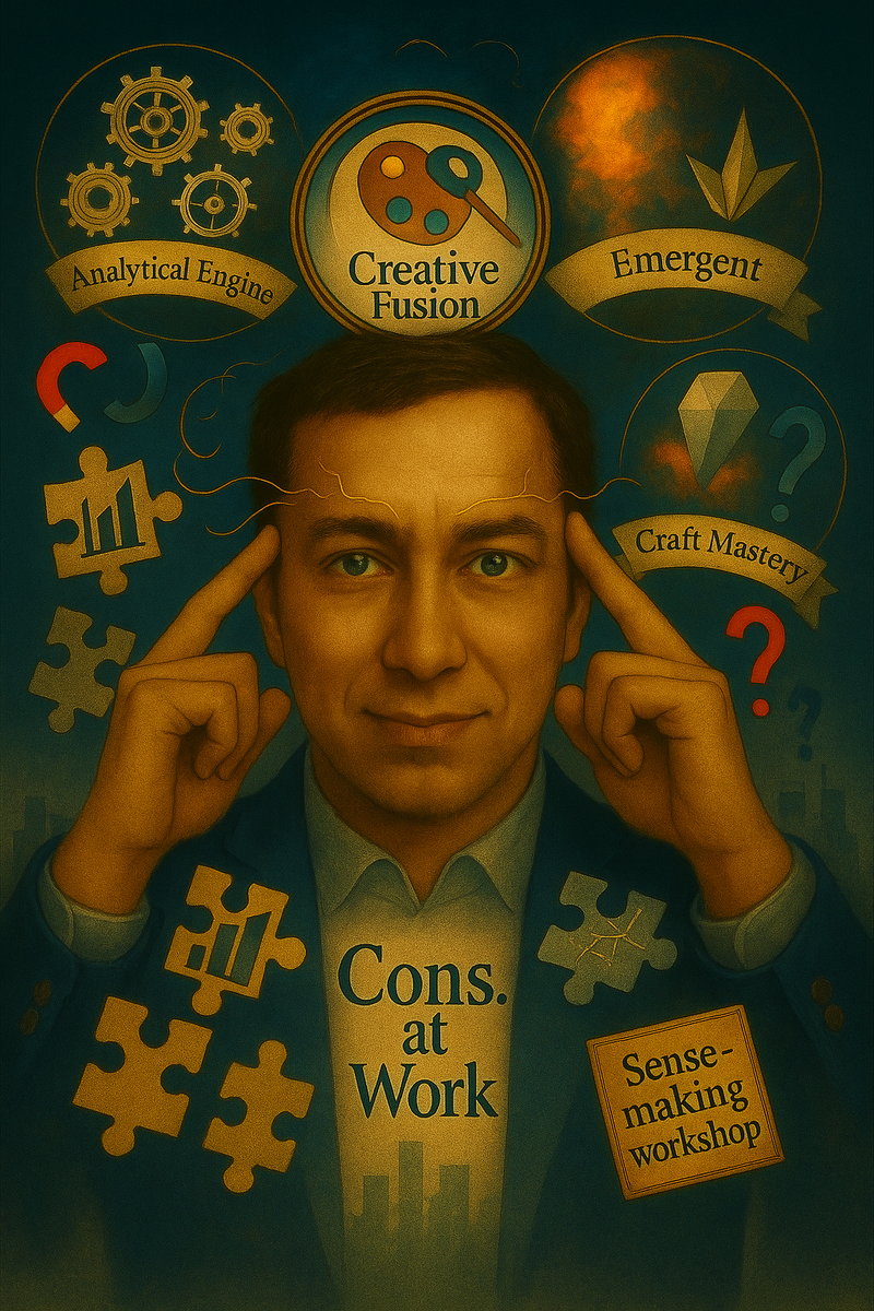 Есть один момент, о котором в стратегическом консалтинге говорят редко - потому что его, в целом, сложно объяснить. Но именно он определяет качество работы. Речь не про навыки, модели или опыт в индустрии - а про мышление. Консалтинг - это не только лишь про «всё посчитать». Это и не только про «дать совет». Это про то, как и куда вы смотрите. Чуть в сторону. Сквозь привычное. В то место, где ещё ничего не оформлено, но уже начинает проявляться новый контур. Это не просто анализ - это внимание. И не просто внимание - а активное воображение. Когда вы соединяете несочетаемое, подтягиваете знания из других сфер, ставите рядом несовместимые смыслы - и ждёте, пока появится новая форма. Поэтому настоящая стратегия не выглядит как шаблон. Она не укладывается сразу в таблицу. Потому что в начале её просто нет - есть только обрывки, ощущения, мнения, несостыковки, фрагменты, которые не складываются в единую картину. Именно это и интересно. Консультант, работающий со стратегией, не просто «распу