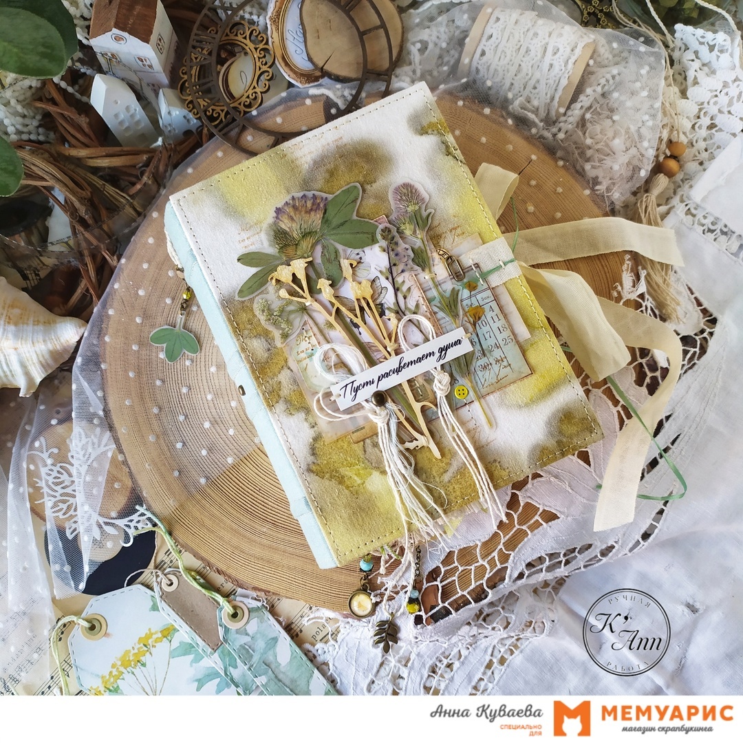 Сегодня я, Анна Куваева, спешу вдохновить вас присоединиться к нашему прекрасному заданию Ботанический атлас! Только не говорите, что вы его еще не видели!?! И обязательные элементы там совершенно не сложные, у меня они все применены, а на обложке решила особенно выделить настоящий гербарий, дождался он своего часа!!! Вообще, многие материалы в этом блокноте действительно «ждали» и дождались своего времени показаться вам! По формату он не большой, самый любимый мой в настоящее время размер А6, удобно тонировать и штамповать бумагу, добавлять конверты, и новенькие папки для тиснения Мимикат тут как раз пришлись «в пору»! Ну что ж смотрим!?? На обложке у меня хлопок, на лицевой части принтованный настоящими растениями, что придает ему особенную ценность, а еще он имеет едва уловимый аромат, ткань хранилась вместе с саше (оно кстати так и будет рядом,положила в кармашек на спинке обложки). Украшает обложку и придает ей смысла конечно настоящий заламинированный гербарий и конечно надпись и