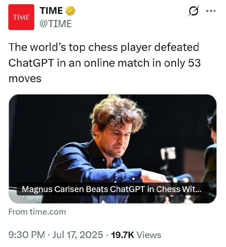 Один из сильнейших шахматистов мира норвежец Магнус Карлсен обыграл ChatGPT за 53 хода, не сдав ни одной своей фигуры. @nemediatema