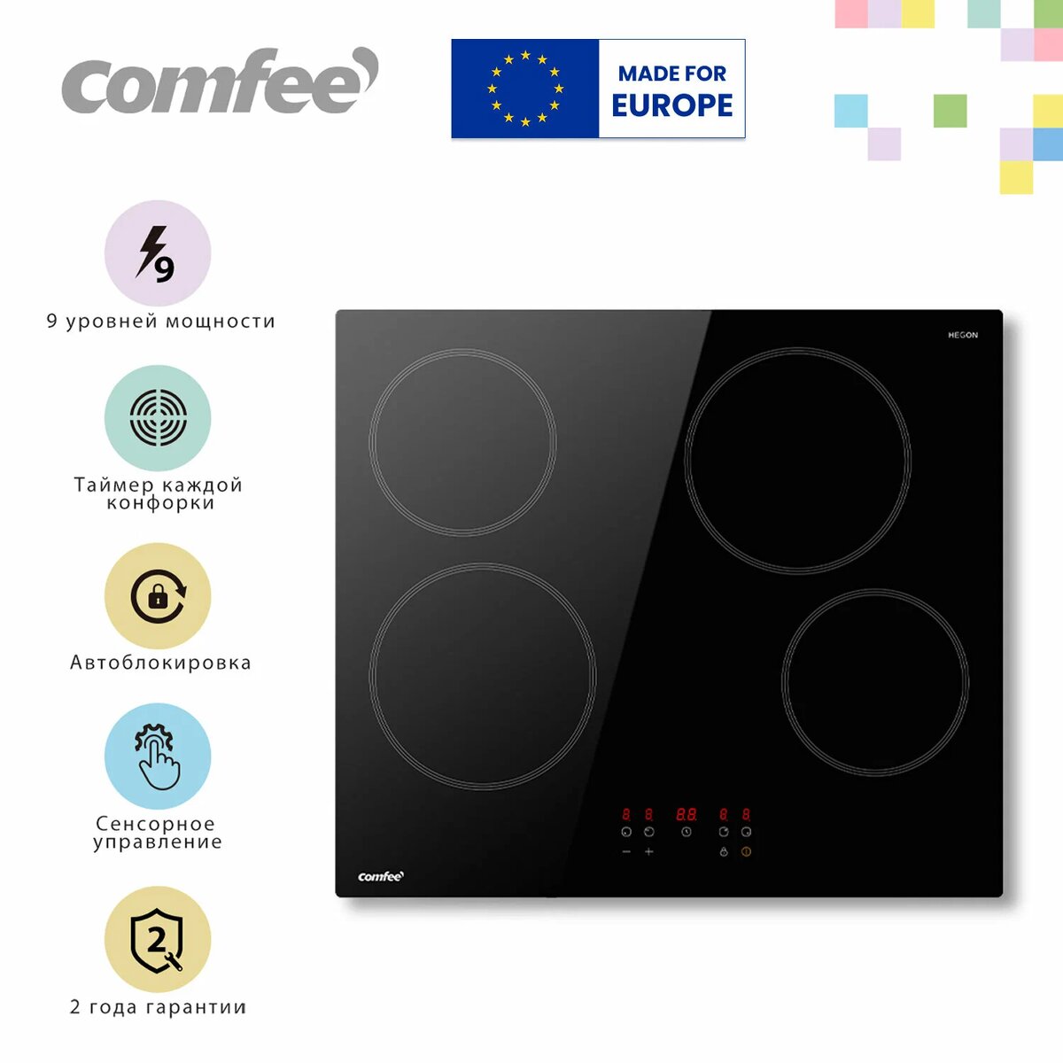 Электрическая варочная панель Comfee CEH601 — стильный помощник на вашей кухне, сочетающий современный дизайн и передовые технологии приготовления пищи. Панель выполнена из прочной стеклокерамики черного цвета, придающего ей элегантный внешний вид и легкость ухода. Особенность модели — наличие четырех удобных зон нагрева разного диаметра, каждая из которых оснащена мощными нагревательными элементами, обеспечивающими равномерное распределение тепла и быструю реакцию на изменение температуры. Сенсорное управление обеспечивает простоту и комфорт эксплуатации, позволяя легко выбрать нужный режим готовки нажатием пальца. Комфорт и безопасность обеспечиваются дополнительными функциями: таймер позволит задать точное время окончания приготовления блюда, а специальная система блокировки предотвратит случайное включение панели детьми или домашними животными. Девять уровней мощности позволяют подобрать оптимальный температурный режим для каждого типа блюд, обеспечивая возможность быстрой жарки, м