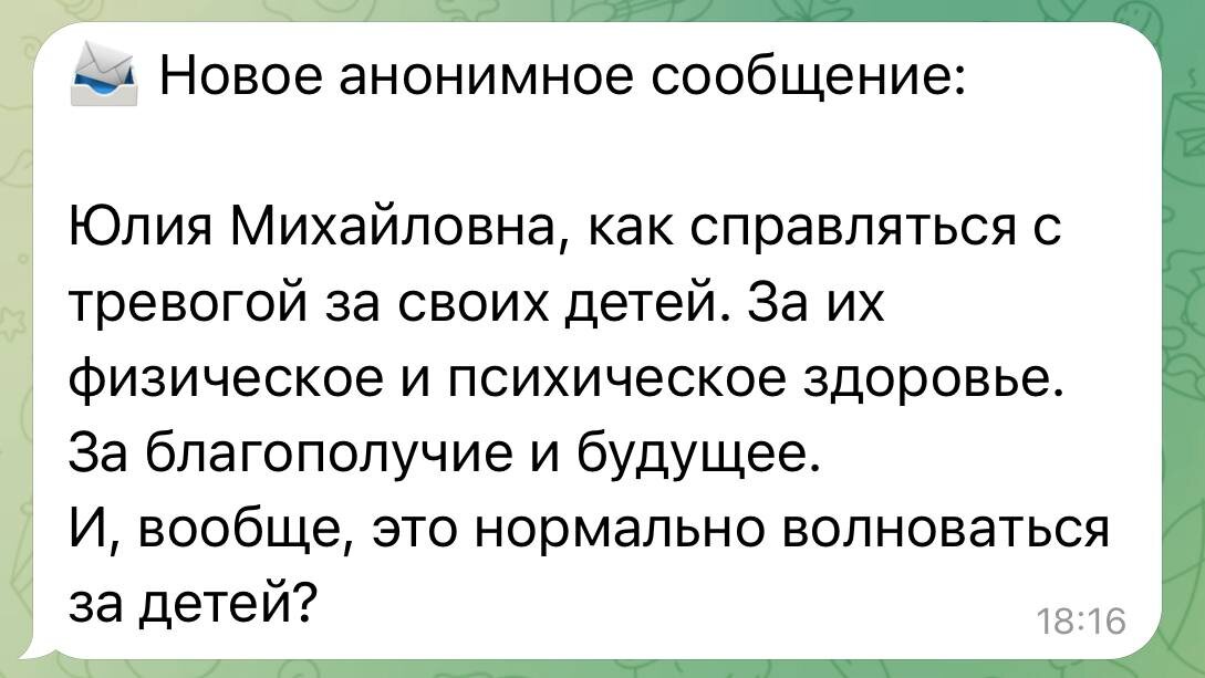 Юлия Михайловна отвечает: Ваш вопрос — это голос любви. И да, волноваться за детей — нормально. Это инстинкт, встроенный в нас природой. Но когда тревога становится фоном жизни, она перестаёт служить защитой и начинает мешать — и вам, и ребёнку. Что делать? 1. Разделите тревогу и заботу Забота — это действие: приготовить полезный завтрак, выслушать, обнять. Тревога — это мучительные мысли: «А вдруг он не справится? А если его обидят?» Практика: Каждый раз, когда ловите себя на тревожной мысли, спросите: → Это факт или фантазия? → Могу ли я прямо сейчас что-то сделать? Если да — действуйте. Если нет — отпустите. 2. Ищите опору в себе Дети считывают наше состояние. Если вы в панике — они чувствуют: «Мир опасен». Если вы спокойны — учатся доверять жизни. Вопрос себе: «Чему я хочу научить ребёнка: бояться или жить?» 3. Изучите свои триггеры Часто наша тревога за детей — это: → Непрожитые детские травмы («Со мной это случилось — значит, и с ним может»), → Чувство потери контроля, → С