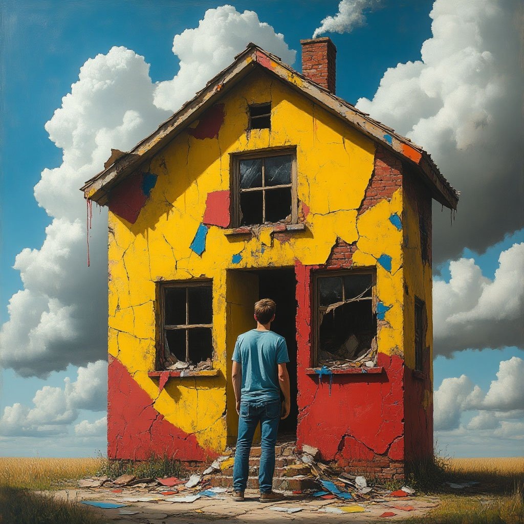 Метафора здесь проста: человек словно дом, который всё время красит снаружи, забывая, что внутри обваливаются стены. Он украшен, но пуст.