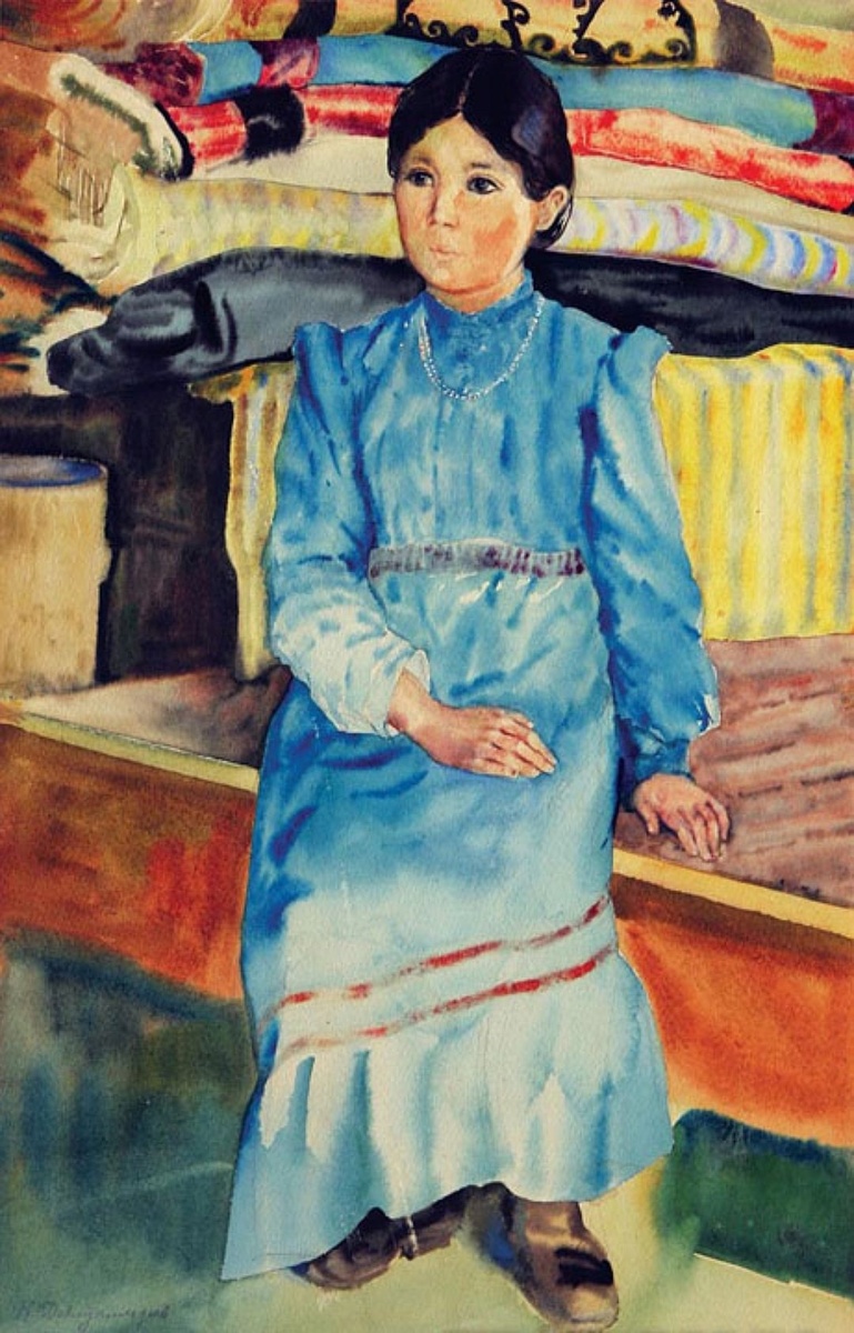А на картине девочка-подросток изображена на фоне подушек, приданого невесты и предметов домашнего обихода. Это образ башкирских девушек катайского рода того периода. Художник также написал на картине дату: «2.9.28 г.»