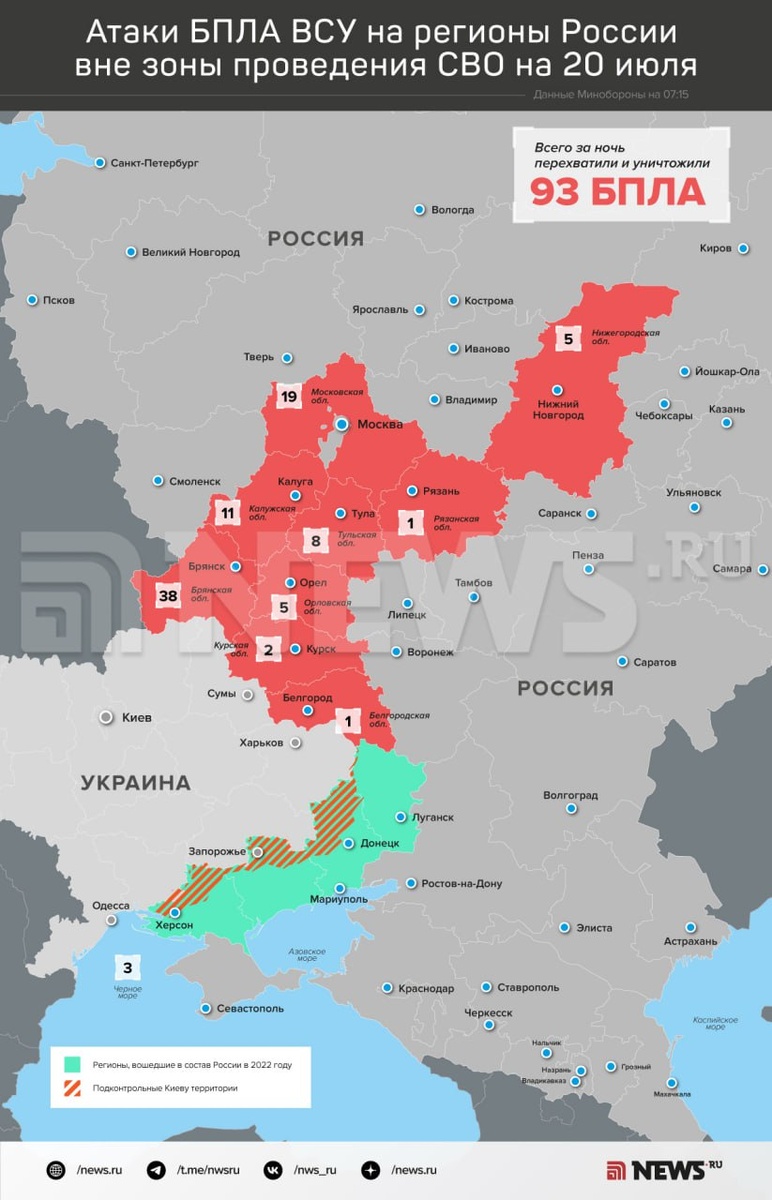 93 украинских беспилотника сбили за ночь силы ПВО над регионами РФ, сообщили в Минобороны. Больше всего дронов уничтожили над Брянской областью — 38 БПЛА, 19 БПЛА — над территорией Московского региона, в том числе 16 дронов летевших на Москву. Еще 11 БПЛА перехватили над Калужской областью, восемь — над Тульской, по пять — над Орловской и Нижегородской, три — над акваторией Черного моря, два — над Курской и по одному БПЛА — над Белгородской и Рязанской областями. ⭕ Подписаться | Прислать новость | Буст