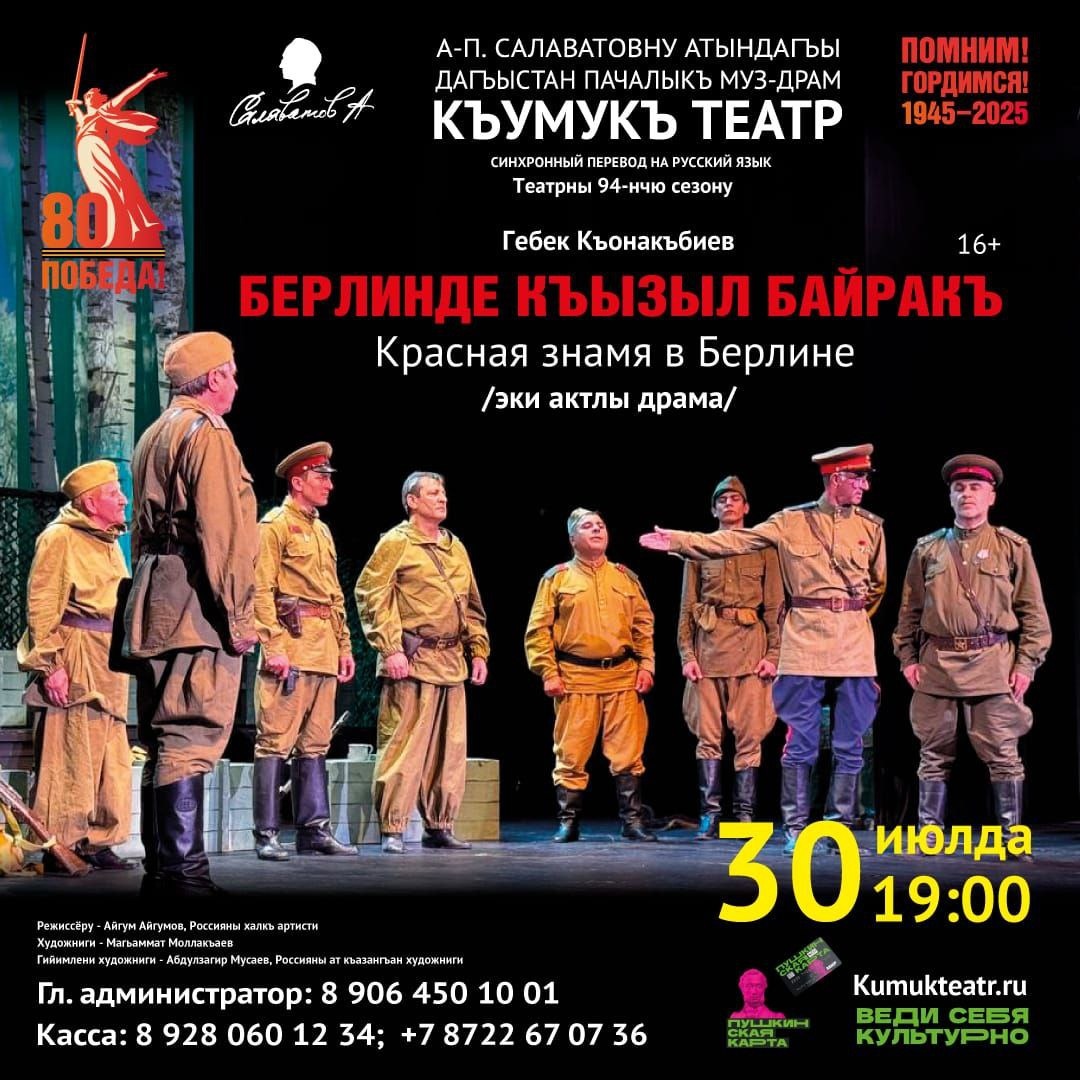 30-нчу июльда 19-00 сагьатда Къумукъ театра Дагъыстанны халкъ язывчусу Гебек Къонакъбиевни пьесасына гёре салынгъан "Берлинде Къызыл Байракъ" деген спектакль гёрсетилежек. Рейхстаггъа байракъ къакъгъан Россияны Игити Абдулгьаким Исмайыловну гьакъындагъы спектакльге къарама барыгъызны да чакъырабыз.