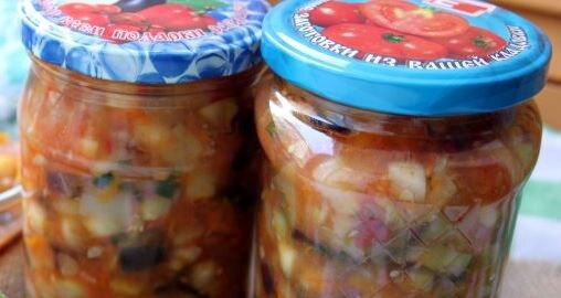 Ингредиенты: - 1 кг баклажанов - 1 кг кабачков - 1 кг сладких перцев - 1 кг моркови - 1,3 кг красных помидоров - 0,1 л 6%-ного уксуса - 200 г чеснока - 0,5 л растительного масла - 200 г сахара - 70 г соли - 300-500 г зелени петрушки - горький перец по вкусу Приготовление: Пропустите помидоры и чеснок через мясорубку, крупно натрите морковь, порежьте кубиками баклажаны, кабачки и перец, мелко нарубите зелень.