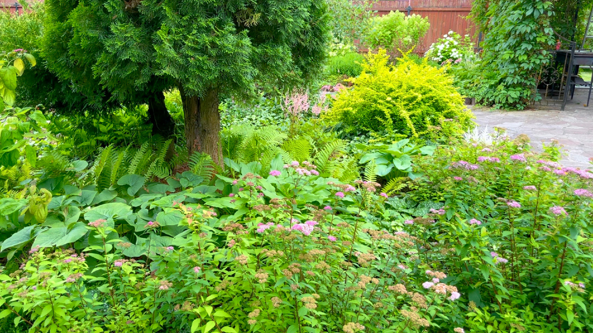 Спиреи летнецветущие с зеленой и желтой листвой, цветущие в середине лета нежно-розовыми соцветиями насеялись от одной, посаженной в эту клумбу около 20 лет назад спиреи желтолистной "Голден Флейм". Рядом растущий барбарис посажен одним из первых, на ряду с туями и зеленолистной подорожников хостой.