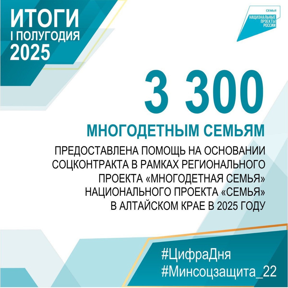 ⚡3 300 многодетным семьям предоставлена государственная помощь на основании социального контракта в рамках регионального проекта «Многодетная семья» национального проекта «Семья» в Алтайском крае в 2025 году. ▶️На предоставление государственной помощи израсходовано 0,5 млрд рублей. 📍Итоги I полугодия 2025 года #Цифрадня #Алтайскийкрай #Минсоцзащита_22 #Итогиполугодия2025 #Итогиполугодия #НацпроектСемья
