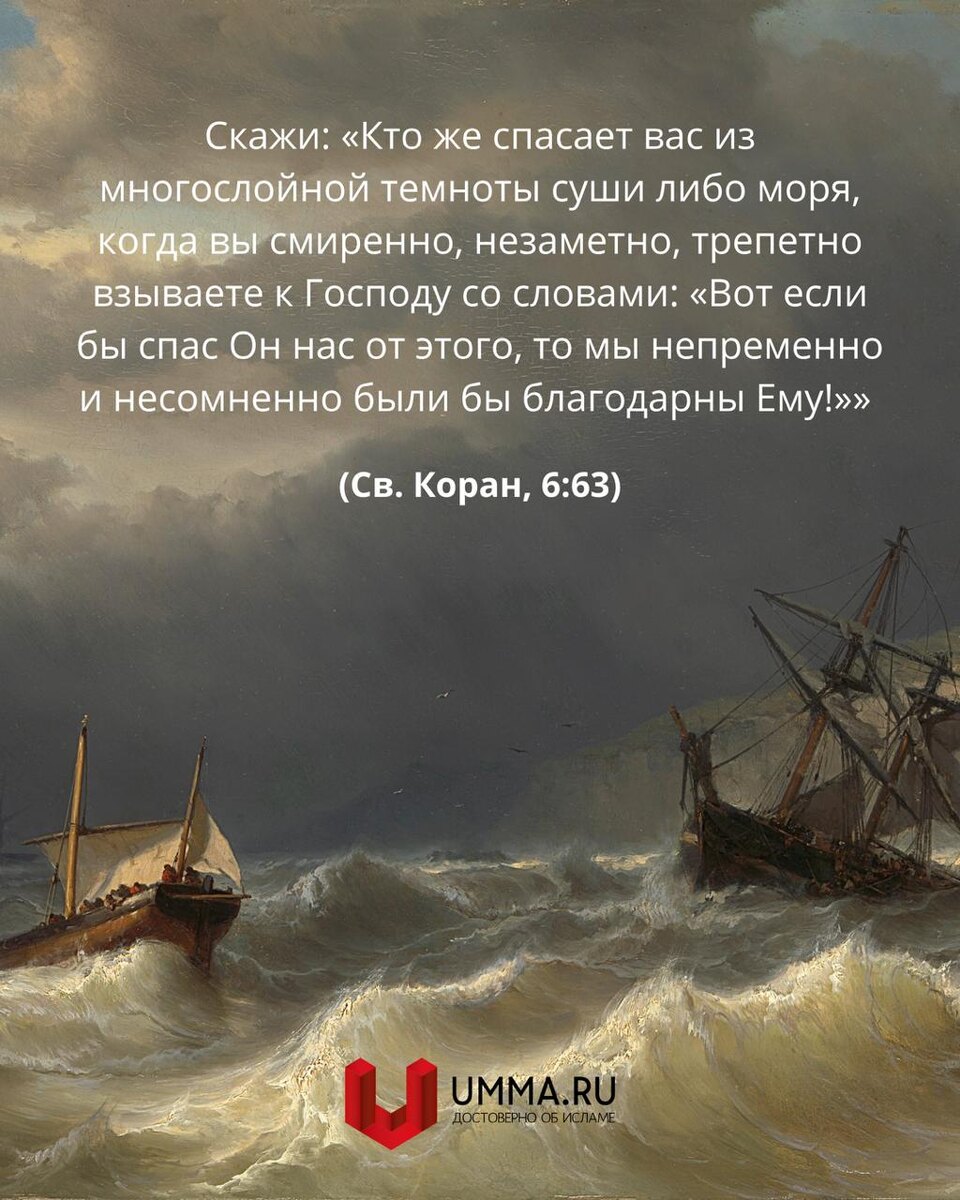 Скажи: “Кто же спасает вас [“вытаскивая”] из многослойной темноты суши [к примеру, песчаных бурь, проливных дождей, ураганов, смерчей, землетрясений] либо моря [штормов, бурь, наводнений], когда вы смиренно (покорно), незаметно, трепетно [осознав-таки свое бессилие перед природным могуществом] взываете к Господу со словами: “Вот если бы спас Он нас от этого, то мы непременно и несомненно были бы благодарны Ему!” [Он, Творец, выводит вас из самых разных видов темноты: из душевной тьмы, в которой человек теряет ориентиры и не находит выхода из сложившейся кажущейся безвыходной ситуации; страхов, опасений; экономических, политических или природных катаклизмов]”. (Св. Коран, 6:63) 📘 Перевод Корана @umma_ru