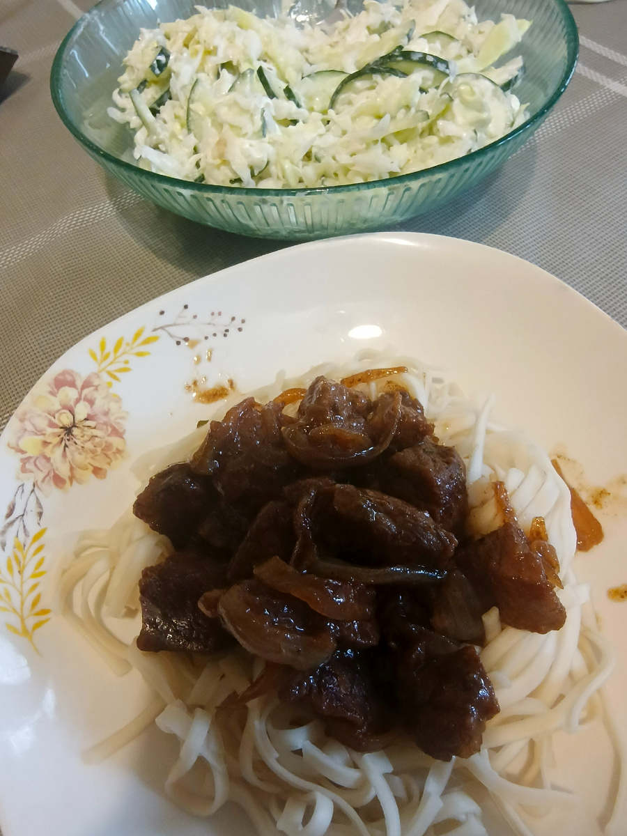 Здравствуйте! Еще одна неделя подходит к концу, а это значит, что осталось всего две до того момента, как я благополучно пойду в отпуск, ттт. Особых планов нет, мой отпуск совпадает с отработкой в школе у сына. Разве что долгожданное посещение стоматолога, на которое вечно нет времени. Всю неделю я царствовала на своем хозяйстве в одиночестве. Сын у родителей, муж на работе. В такие дни я, бывает, готовлю странные вещи, а бывает, и обычно - все зависит чисто от настроения. Покажу, что у меня было на ужин в минувшую неделю. Говядину я не просто потушила, а сделала это с соевым соусом и медом. Этакая азиатская нотка присутствует. К ней отварила лапшу и сделала салат и молодой капусты и свежих огурцов со сметаной. Это были последние запасы стейков из минтая, которые благополучно ушли на полюбившееся мне блюдо. Я уже не знаю, сколько раз говорила, что готовлю так минтай. Филе обжариваю небольшими кусочками, а потом заливаю взболтанным яйцом. Если вы такое не пробовали, очень советую! Еще