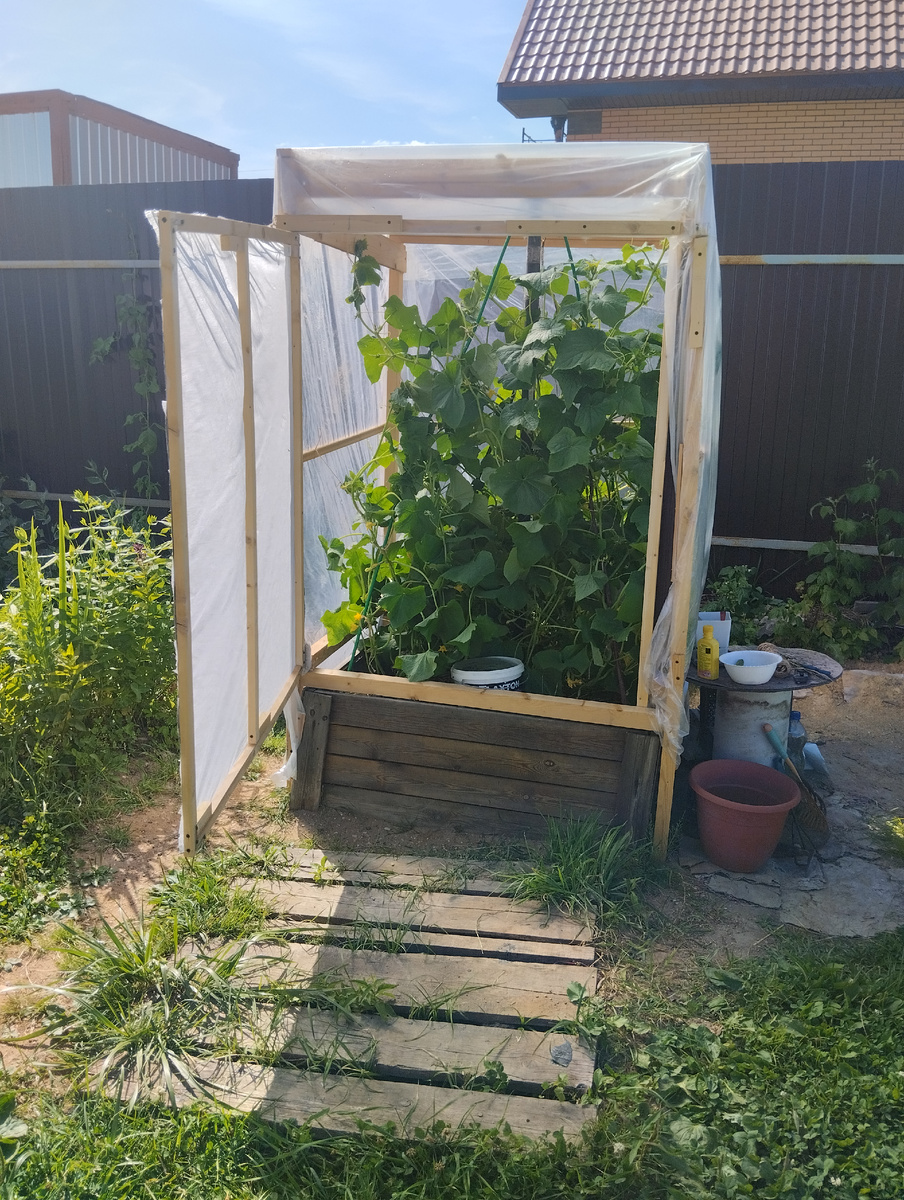 Перед поездкой ДМ доделал домик для огурцов. У нас была и до этого подобная конструкция, но более хлипкая.