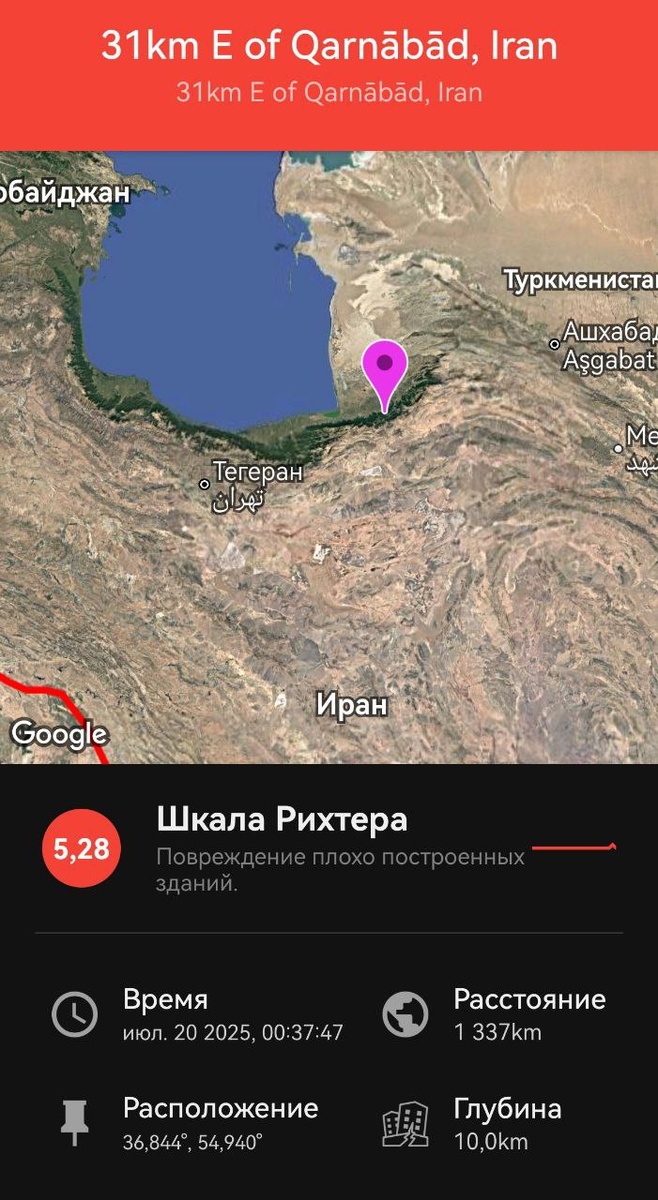 В ответ на пост Иран у Каспийского моря пока что получил лишь умеренное землетрясение М5+. Сейсмический процесс в регионе идет по нарастающей магнитуде. Дальше будет либо дальнейший рост, либо спад. Посмотрим... ==== Iran has so far received only a moderate M5+ earthquake near the Caspian Sea. The seismic process in the region is increasing in magnitude. Then there will be either further growth or decline. We'll see...
