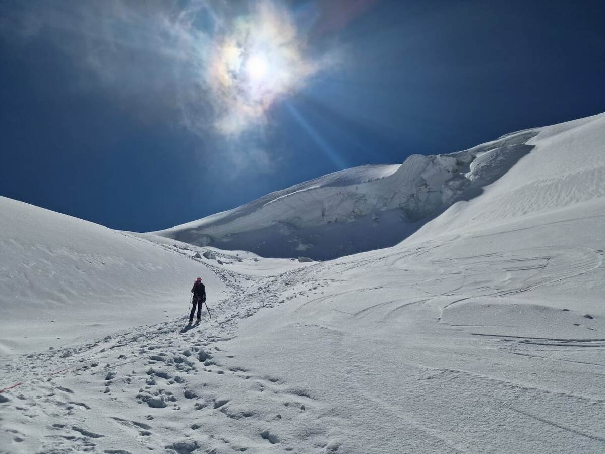 Итак, мы идём на вершину пика Музтаг-Ата в китайском Памире (начало здесь). Гора накрыта, словно шапкой, гигантскими старыми ледниками. Они не только очень длинные - порядка 20 км, но и очень толстые, несмотря на то, что уже особо не растут. По леднику и проходит подъём. Ледники сползают вниз и разламываются, и эти разломы огромны. Местность красивая, идём над облаками. Эти огромные разломы не опасны, поскольку очень заметны. Но есть и узкие трещины, сверху присыпанные снегом и ведущие на десятки метров в глубину. Кое-где они вскрываются, иногда прямо на тропе, и становится понятно их коварство. Этот с виду маленький провал - часть здоровенного разлома, который тянется до самого подножия ледника. Тропа маркирована красными флажками, но она явно проходит не по самой безопасной траектории. Наша группа идет в связке, остальные - на свой страх и риск. Здесь много неопытных альпинистов, которые не ориентируются на местности и могут поставить палатку прямо на закрытой трещине, как на фото н