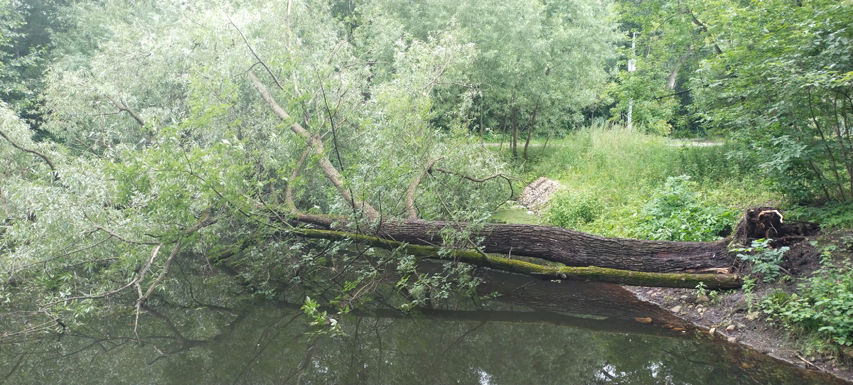 Доброго воскресное утро всем добрым людям и моим читателям! Как у вас настроение? Как погодка? Воскресенье, а всё равно проснулась рано. Обычно каждое утро просыпаюсь - чашечка натурального кофе с утра и Дзен. А сегодня решила прогуляться в парк. Заодно Парнишкам травки нарвать. Нет...чашечка кофе была, конечно! Но в начале восьмого я уже гуляла... Вы знаете, погодка такая в столице нашей Родины...жара стояла невыносимая неделю, пекло в 36-37 градусов, а сейчас после этого зноя каждый день гремит, сверкает, льёт...порывы ветра такие, что страшно становится! Вчера попали под ливень. А вот такой сюрприз меня ждал в парке... Огромное дерево упало прямо в пруд, вернее два дерева. Я думаю, что большое зацепило собой дерево, которое поменьше. Может фотография и не передаёт масштабы, но это ужасно страшно! Не хочу таких сюрпризов. Воскресенье, пасмурно с утра, но люди в парке были: рыбаки, спортсмены на пробежке, владельцы собак. Уточки на прудах. Красота, конечно! Прогулялась, воздух све