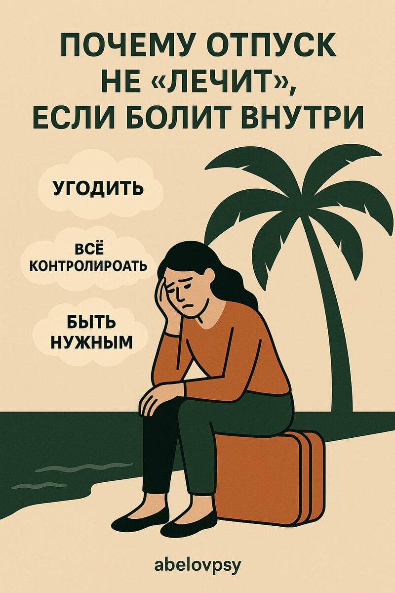 🧠 Почему отпуск не «лечит», если болит внутри Летом многим кажется: «Отдохну, и всё пройдёт». ⠀ Но тревога, самокритика, эмоциональные сценарии — они едут с нами. Даже если ты отключаешь почту и меняешь часовой пояс — в голове всё те же мысли: — угодить, — всё контролировать, — быть нужным, — и другие Новая локация — не отменяет старые автоматизмы и поведение. ⠀ 🚩 Если отпуск является единственным способом сбежать — это не отдых, а бегство. ⠀ И что тогда делать: — заметить повторение; — понять, что именно вызывает тяжесть и от чего мы бежим? — задать себе честный вопрос: я бегу или отдыхаю? — дать себе честный ответ: от кого или от чего я бегу? ⠀ 🛑 С собой не убежать от себя. Но можно научиться жить по-другому. Терапия и осознание себя — не только про боль. Это про то, чтобы снова быть собой. И не только в отпуске. #абеловпси #мышление #тревога