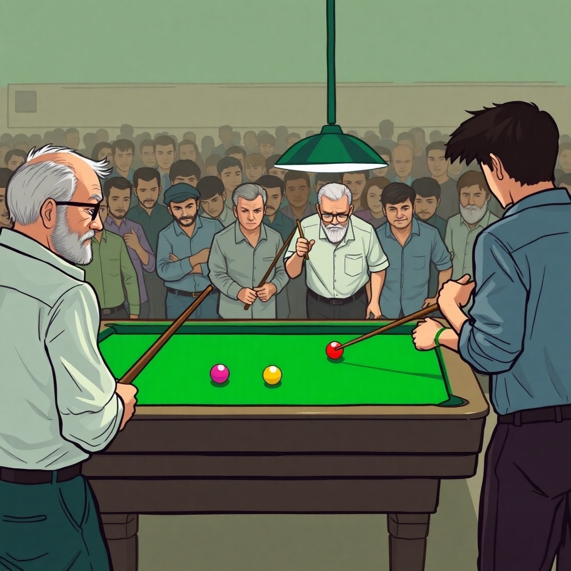 Там играл пожилой мужчина. Закатил один шар, другой... Промазал. Его противник вступил в игру.