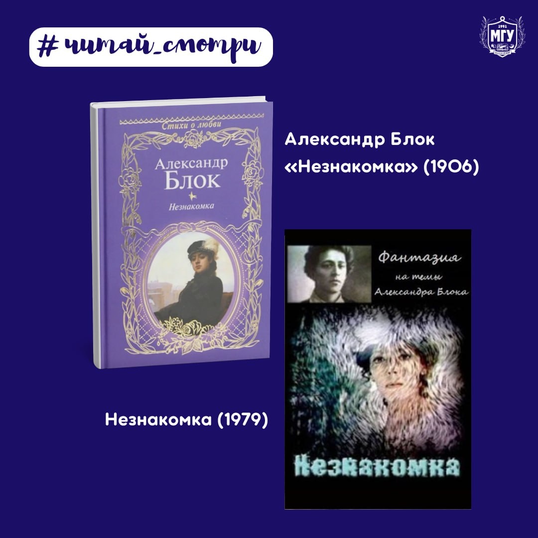 #читай_смотри 💙 Магия случайных встреч, что остаются в сердце навсегда. 💙 Книга: Александр Блок «Незнакомка» (1906) Поэма о таинственной женщине, которая оставляет неизгладимый след в душе мужчины. Блок в своём произведении воплощает мистику и романтику, рассказывая о любви, которая не даёт покоя, но при этом уходит в тень, оставляя лишь ощущение неуловимого счастья. 💙 Фильм: Незнакомка (1979) Экранизация, в которой режиссёр передаёт атмосферу загадочности и неопределённости, присущую оригиналу. Фильм глубоко погружает зрителя в мир мистики, чувственности и переживаний, который раскрывает душу героя и его навязчивое стремление к идеализированному образу любви. #МГУимениКуинджи