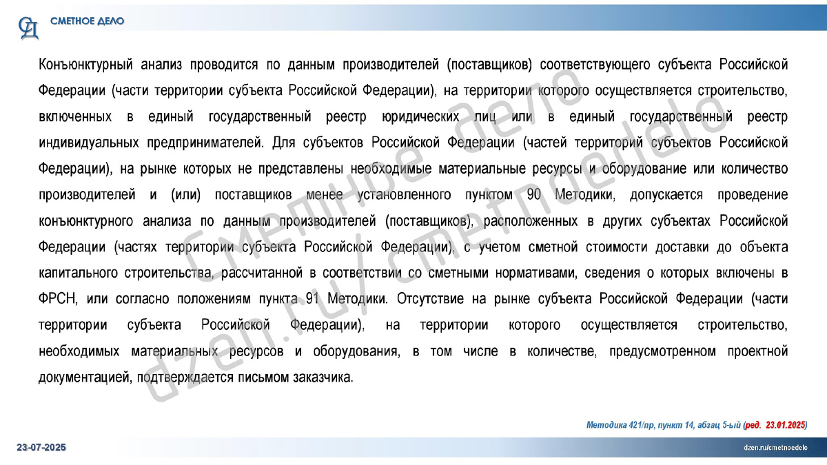 Приказом Минстроя России от 23.01.2025 №30/пр в Методику определения стоимости строительства (приказ Минстроя России от 04.08.2020 № 421/пр) (далее - Методика 421/пр) внесены изменения в том числе в части конъюнктурного анализа. Общие правила к обосновывающим документам в части производителей и поставщиков приведены в пятом абзаце пункта 14 Методики 421/пр: Какие новые требования необходимо соблюдать при формировании конъюнктурного анализа? 1) В первом предложении появилось требование "включенных в единый государственный реестр юридических лиц или в единый государственный реестр индивидуальных предпринимателей": Это означает, что проверку на присутствие в ЕГРЮЛ, а также деятельность (чтобы предприятие не было на стадии закрытия, реорганизации и т.д.) на дату составления конъюнктурного анализа необходимо выполнять специалисту (как правило, инженеру сметного дела заполняющему таблицу конъюнктурного анализа). Правило учитывать данные производителей и поставщиков субъекта РФ, на территории