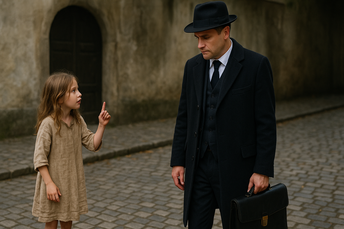Но она просто подошла и положила на стол перед ним фотографию. Маленькую. Пожелтевшую. Та самая — девочка в рваном свитере и мужчина в чёрном пальто.