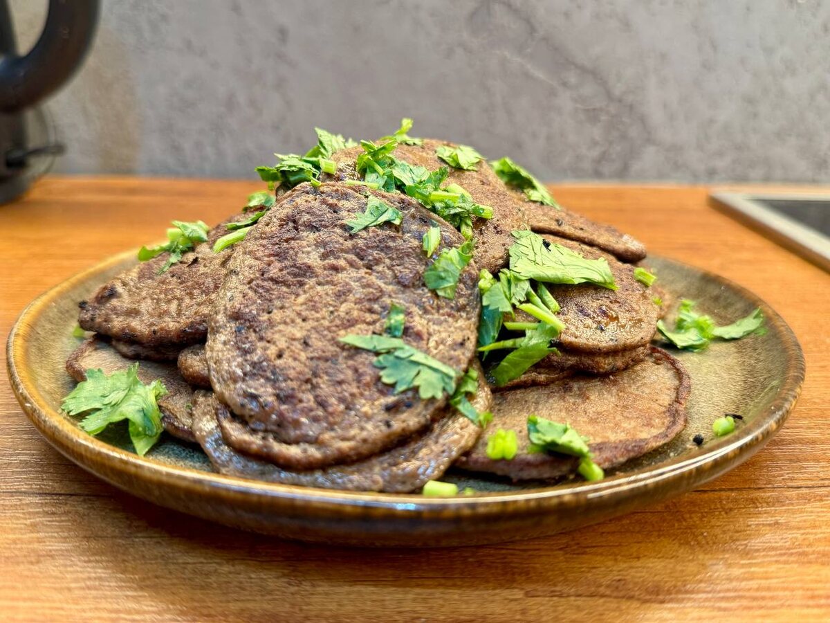 Печёночные оладьи Сегодня по-простому, так как осталось немного печёночной массы от вчерашних кабачков. Это прекрасная основа как для оладьев, так и для печёночного торта. Торт, конечно очень вкусно, но жирно. Поэтому оладьи Ингредиенты: 1️⃣ Куриная печень - 500 гр 2️⃣ Лук репчатый - 1 шт (150 гр) 3️⃣ Яйцо куриное (со) - 2 шт 4️⃣ Мука - 1 ст.л с горкой 5️⃣ Чеснок - 1 крупный зубчик 6️⃣ растительное масло для обжарки - 2-3 ст.л 7️⃣ Специи: - соль - 10 гр - Тимьян - 1 ч.л - Копчёная паприка - 1 ст.л - Чёрный перец - 1 ч.л Приготовление: 1. Печень и лук прокрутите на мясорубке или перебейте блендером. 2. Добавьте яйца, муку и специи. Тщательно перемешайте (можно блендером) 3. Разогрейте на сковороде масло с раздавленным зубчиком чеснока И добавьте несколько порций печени, по 1-й столовой ложке. 4. Переверните на другую сторону и также подрумяньте 5. На среднем огне обжаривайте около 5 минут. 6. Снимите со сковороды и посыпьте зеленью Ангела за трапезой! Ваш ПП - Православное Питание