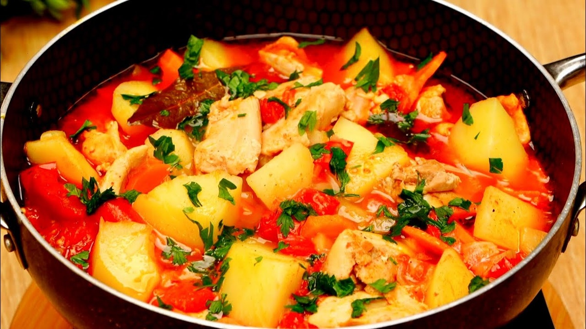 Уменьшите огонь, накройте крышкой и тушите 15-20 минут, пока картофель не станет мягким. - Подача: