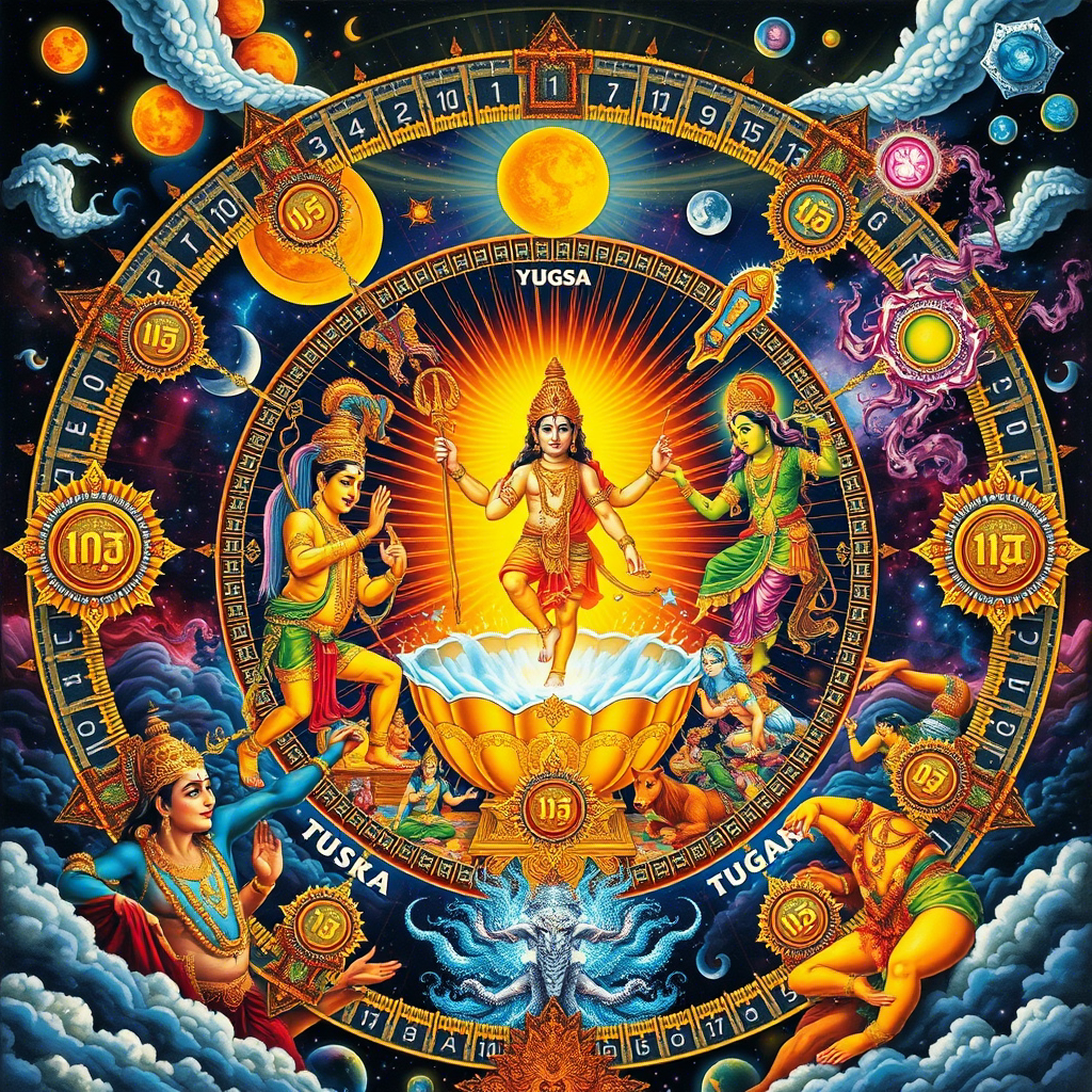 Но это лишь песчинка в часах Брахмы! День Брахмы (кальпа) равен 4.32 млрд лет — почти возрасту Земли. За это время сменяются 14 Ману, праотцов человечества. Затем наступает Ночь Брахмы — еще 4.32 млрд лет хаоса. А полная жизнь Брахмы? 360 таких дней и ночей составляют его год, а живет он 100 лет — 311 триллионов лет! После этого наступает махапралая (Великое Разрушение) — и цикл начинается заново. Представьте: динозавры вымерли всего за полвдоха Брахмы, ведь один его вдох длится 432 млн лет!