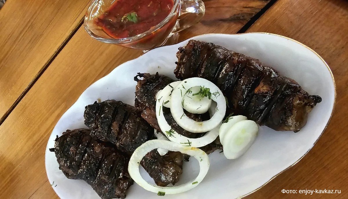 Жаубаур — шашлык из печени Жаубаур — это национальное балкарское блюдо, которое готовят из бараньей печени, обернутой в бараний же жир (в переводе с балкарского: жау — жир, масло, а бауур — печень). Самое сложное в приготовлении жаубаура — выбор правильной бараньей печени. Она должна быть той самой первой и единственной свежести. Важно, чтобы барашек был молодым. Нанизанную на шампур печень дважды оборачивают сальником — это тонкая пленка внутреннего жира барашка. Обернув печень сальником, его обвязывают ниткой, чтобы при жарке жир не размотался и не упал. Дальше шампуры с сырым жалбауром отправляются на угли. Открытый огонь жалбаура касаться не должен. Над углями блюдо томится от 10 до 20 минут, в зависимости от размера кусочков. Все это время от него следует не отходить ни на шаг и постоянно поворачивать шампуры, чтобы печень подрумянилась равномерно. Готовность шашлыка проверяют, надрезав кусочек ножом: как только жалбаур стал равномерно коричневым, пора есть. Прямо на шампуре его