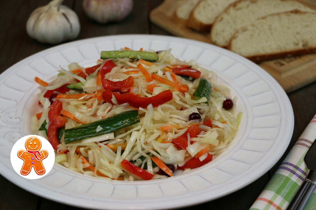 Сегодня готовлю салат из маринованной капусты «Витаминный». Салат готовится очень просто, а получается очень-очень вкусным, полезным и празднично-ярким. Его можно подать и к семейному обеду, и поставить на праздничный стол. Улетает он, как правило, в первую очередь. Давайте приготовим! Ингредиенты: