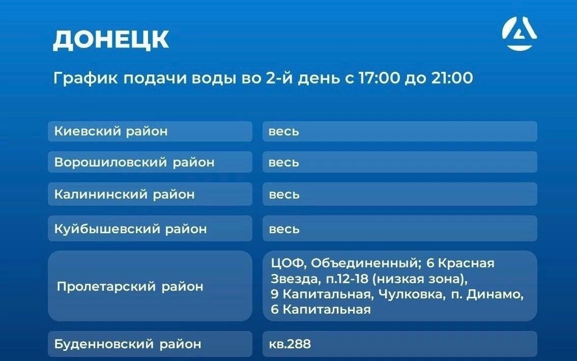 Донецкая группа новостей|Донецк.ДНР (VK) График подачи воды в Донецке с завтрашнего дня https://dzen.ru/media/donetskdpr/grafik-podachi-vody-v-donecke-s-zavtrashnego-dnia-687c91306218992621e673e2