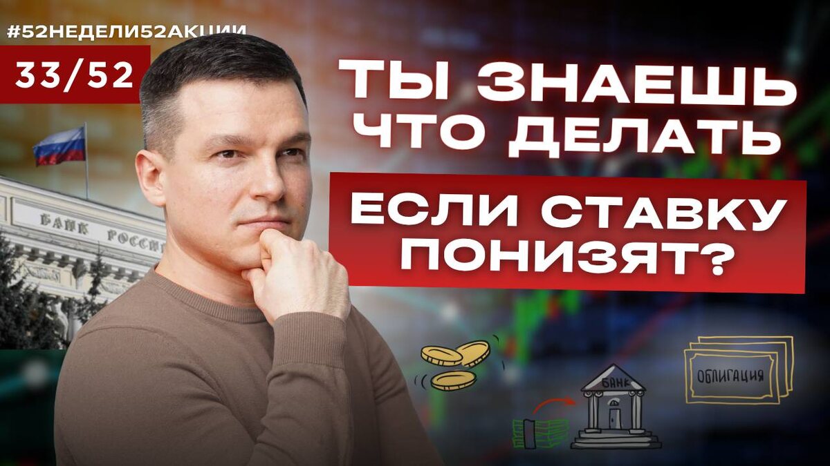 ✔️Как заработать на снижении ставки? Тридцать третий выпуск второго сезона #52недели52акции уже доступен на всех площадках: 👉Смотреть на YouTube 👉Смотреть на RuTube 👉Смотреть в ВК 👉Смотреть на Дзен В этом выпуске второго сезона #52недели52акции поговорим о последствиях снижения ключевой ставки, как формировать капитал на рынке и, главное, совершим новую сделку в рамках проекта. Основная цель проекта #52недели52акции – показать большому количеству людей, что инвестиции это несложно: они могут занимать всего 10 минут в месяц, не заставляя человека страдать от постоянного мониторинга за ценами. Приятного просмотра! 🖼Алексей Линецкий | 🔗Сайт 📹Youtube | 📹Rutube 🔒Закрытый клуб | 🎧Подкасты