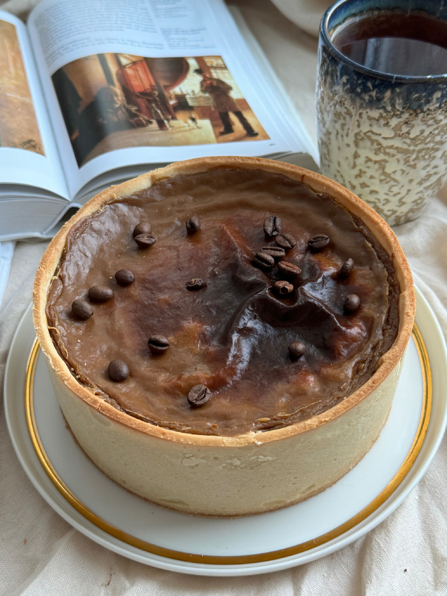 - Яйца, желтки и сахар взбейте венчиком, добавьте крахмал, взбейте. Молоко, сливки доведите до кипения, закиньте кофе, перемешайте, полейте на смесь, помешивая. Перелейте обратно, на слабом огне, мешая, доведите до первого бульканья, можете пробить блендером. Перелейте на тесто, Пеките 35 минут при 180 С. Остудите в комнатной температуре немного, уберите в холодильник на 3 часа и более.