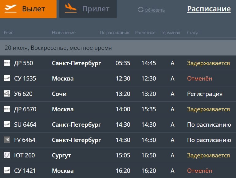 В расписании аэропорта Челябинска на сегодня больше отмененных и задержанных рейсов, чем тех, что выполняются по расписанию