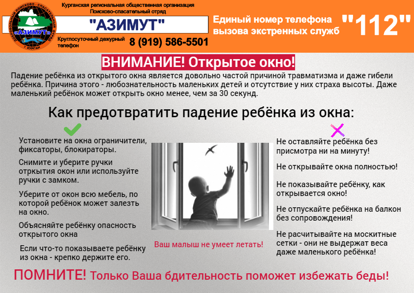Дорогие друзья! В летний период учащаются случаи падения детей из открытого окна. Тревожные сообщения об этом приходят из разных городов. Чаще всего это происходит по вине родителей. Малыши очень любопытны и не всегда понимают опасность! Окно для них — это не просто стекло, а целый мир, полный заманчивых приключений. Но высота таит в себе огромную опасность. Тем более, что до определённого возраста у ребёнка отсутствует страх высоты. Большинство случаев падения детей происходит, когда родители оставляют их без присмотра. 1. Не оставляйте ребёнка без присмотра. 2. Не позволяйте ребёнку играть на подоконнике. 3. Уберите от окна все предметы (мебель, вещи), по которым ребёнок может залезть на подоконник. 4. Открывайте окно в режим проветривания. 5. Используйте ручку с замком, блокираторы, можно снимать ручку, чтобы ребёнок не смог открыть окно. Не думайте, что ребёнок не сможет открыть окно, он откроет его менее чем за тридцать секунд. 6. Не полагайтесь на москитные сетки. Москитная се