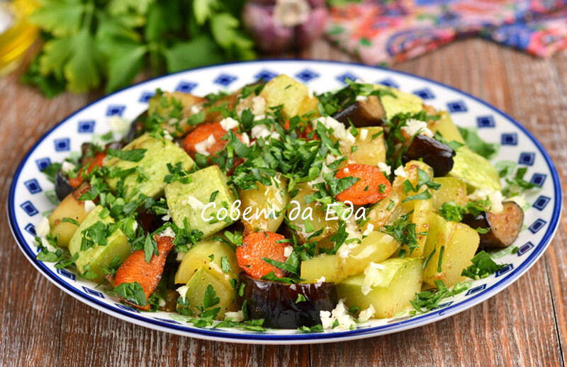 Соте из овощей перекладываем на тарелку и посыпаем мелко нарезанным чесноком (3 зубчика).