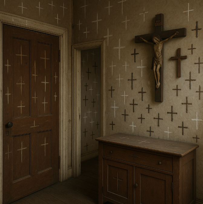 Уже на пороге стало ясно: кресты были везде. На дверях, стенах и даже мебели. Не просто иконы или церковная утварь — именно кресты. Нарисованные мелом, вырезанные в дереве, выложенные из гвоздиков на стенах. В некоторых комнатах их было так много, что казалось, будто попал в музей христианского искусства.