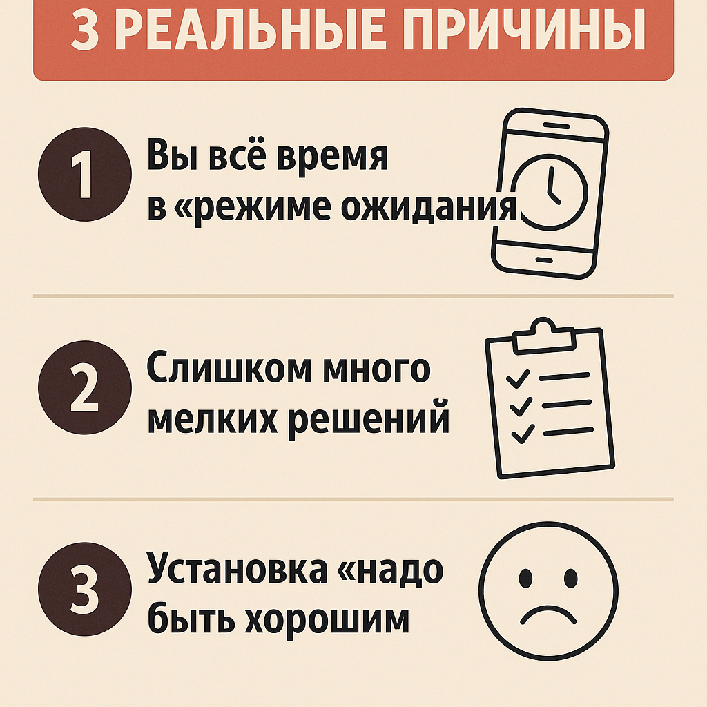 Усталость — это не всегда про «мало спал». Иногда ты высыпаешься, но просыпаешься уже выжатым. Сам проходил через это. Вот 3 причины, которые оказались неожиданными, но реальными. 💡 1. Вы всё время в “режиме ожидания” Ты можешь отдыхать, но не отдыхать. Постоянно проверяешь телефон, ждёшь звонка, смотришь, что будет дальше. Мозг не выключается, а значит — не восстанавливается. Что делать: Убирай “шум” в выходные. Телефон в авиарежим хотя бы на 3 часа. Настоящий отдых — это отключение от внешнего шума, а не просто лёжа на диване с телефоном. 💡 2. Слишком много мелких решений Что надеть, что поесть, когда выйти, кому ответить… Каждый день мы делаем 100–200 микрорешений. Это называется decision fatigue — усталость от постоянного выбора. Что делать: Автоматизируй всё, что можно: 💡 3. Ты в хронической “надо быть хорошим” установке Ты стараешься угодить всем, быть “правильным”, не сказать “нет”. Это не видно, но энергии уходит вагон. Что делать: Разреши себе быт