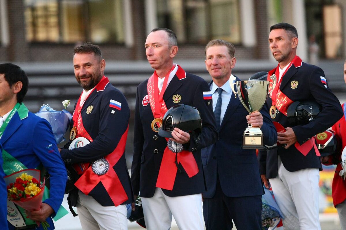 Россияне выиграли Кубок Наций в рамках Евразийских игр по конкуру Россияне продолжают пополнять архив командными трофеями – на этот раз национальная сборная стала победителем Евразийских игр по конкуру. Решающий маршрут «в два гита» с высотой препятствий до 145 см прошел на Олимпийском поле Maxima Park в пятницу, 18 июля. Выступая полным составом из 4 всадников, Дарья Самохина, Евгений Овчаренко, Михаил Шемшелев и Сергей Петров уже в первом гите сделали заявку на лидерство, завершив маршрут с общим результатом 8 ш.о. Второе место после окончания первой части испытаний делили между собой команды Кыргызстана и Узбекистана – каждая из них финишировала, набрав 20 ш.о. Второй гит представители Кыргызстана закончили без штрафных очков, что позволило им оставить на третьей позиции соперников. А вот догнать россиян не получилось – еще 8 ш.о. , набранных хозяевами турнира, укрепили команду России на первом месте. @ФКСР