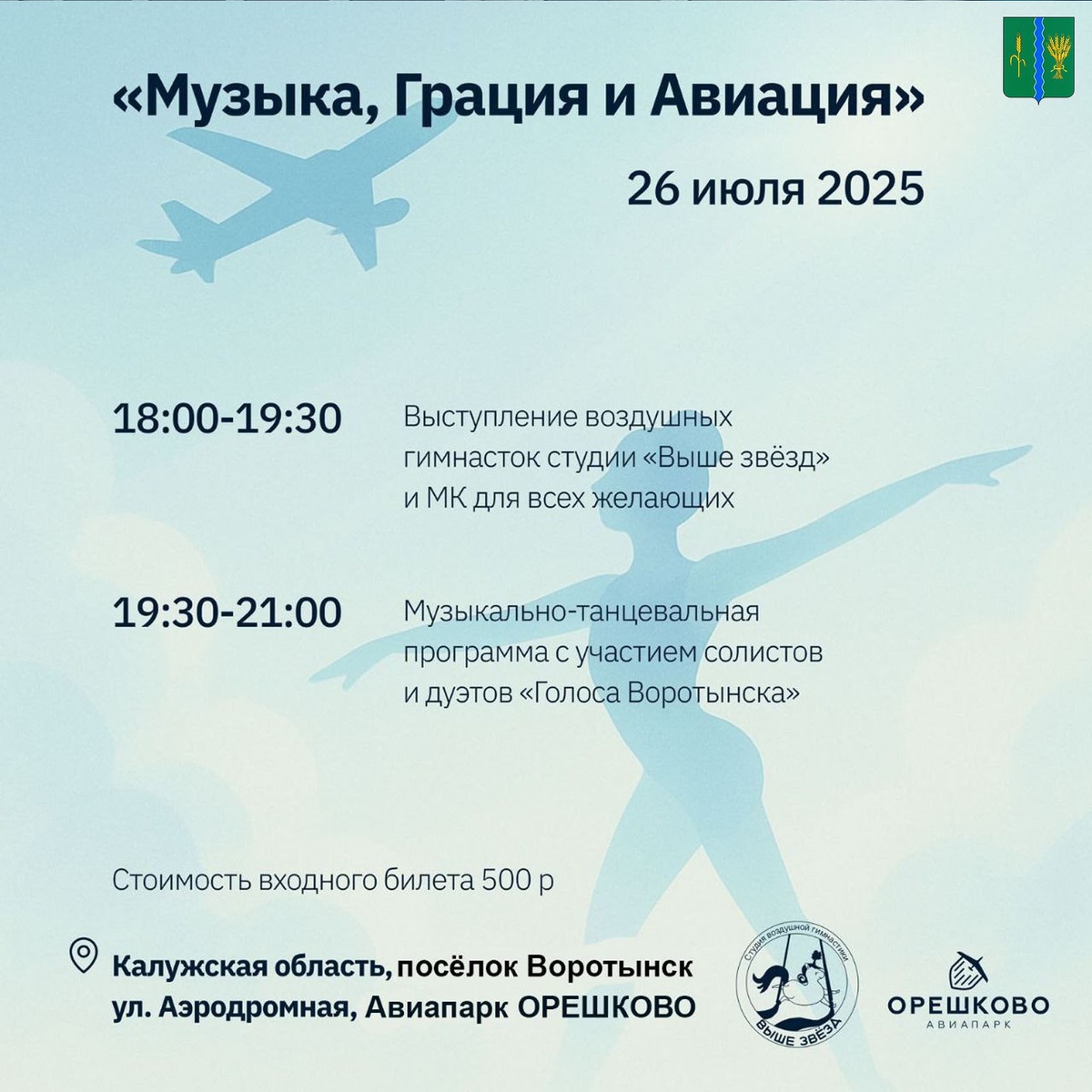 💃✈️ Друзья! 26 июля в Орешково впервые состоится фестиваль «Музыка, Грация и Авиация». На площадке для вас выступят воздушные гимнасты, а для всех желающих проведут бесплатный мастер-класс! При этом, если повезет с погодой - посетители смогут наблюдать работу лётчиков аэродрома Орешково в небе над фестивалем. А закончится вечер выступлением музыкального коллектива "Голоса Воротынска". 📌 Начало в 18:00, билеты можно приобрести на сайте www.aviaparkoreshkovo.ru 👶 Детям до 7 лет включительно - вход бесплатный (билет не требуется), количество билетов ограничено.