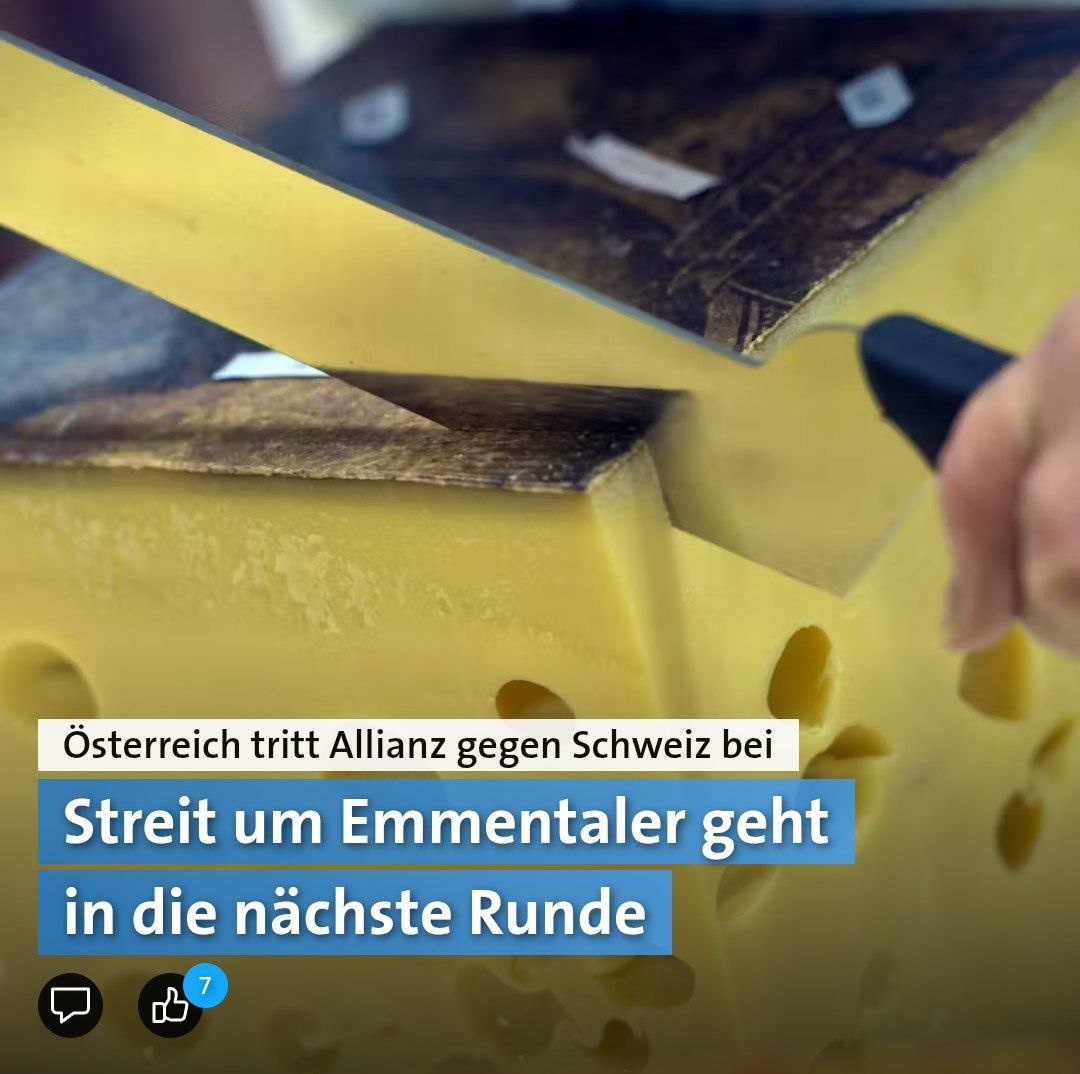 📌 " В судебном споре о названии Emmentaler противники Швейцарии получили поддержку. Австрия присоединилась к альянсу Германии, Франции, Нидерландов и Польши. Юридический спор вокруг чрезвычайно популярного сыра "Эмменталер" длится уже несколько лет. Швейцария хочет зарегистрировать сыр в качестве наименования места происхождения. Противники утверждают, что название "Эмменталер" уже давно стало обозначением сорта сыра "