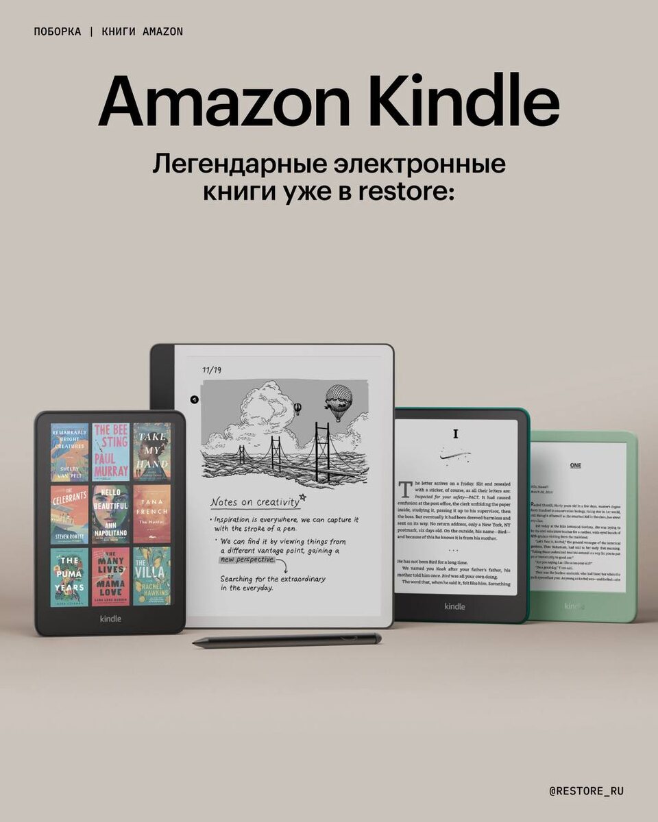 Заваривайте чай, берите плед и устраивайтесь поудобнее — читать теперь ещё приятнее 🙌 В restore: появились обновлённые ➡️ Amazon Kindle — для разного настроения и разных привычек: ✨ Kindle 11 — самая лёгкая и компактная. Теперь с яркой подсветкой и чётким дисплеем без бликов. Берите с собой и читайте в метро, в кафе, где угодно ✨ Kindle PaperWhite — классика в новой версии. 7-дюймовый экран и тёплая подсветка. А ещё — влагозащита, если захотите читать у бассейна ✨ Kindle Scribe — для тех, кто читает и пишет. Делайте пометки прямо в книге и импортируйте документы с помощью стилуса в комплекте Все Amazon Kindle уже доступны в restore:.