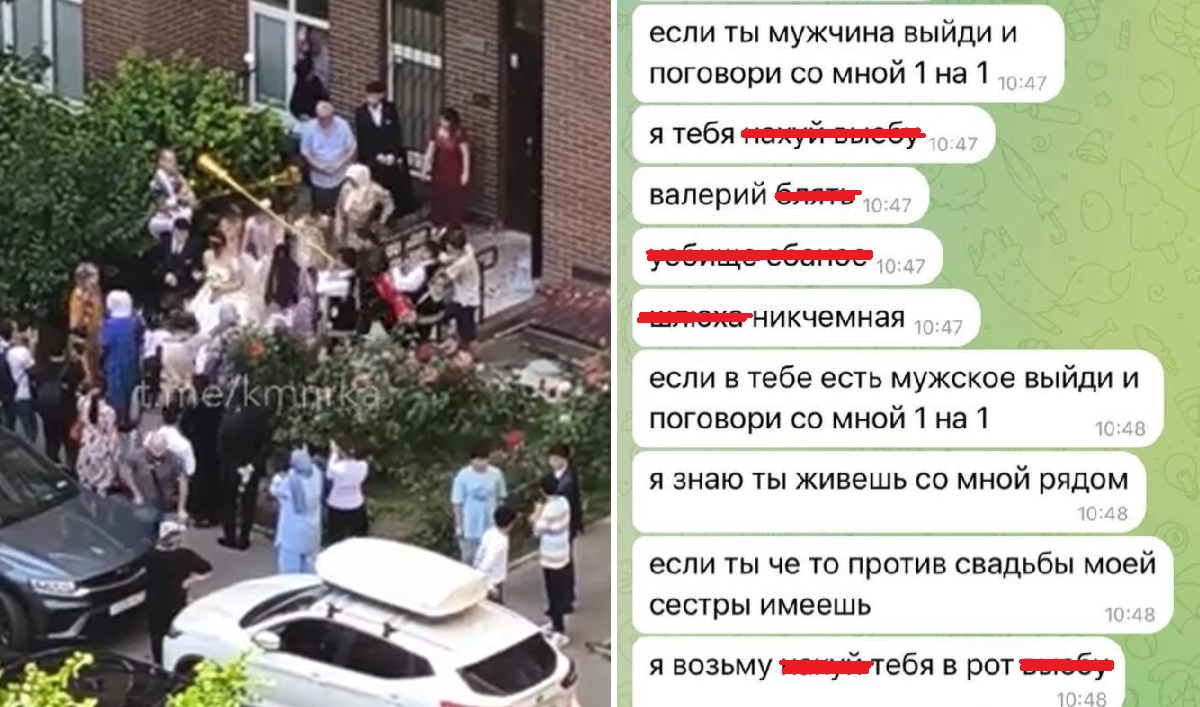 "Если ты мужик — выйди и поговори со мной 1 на 1. Я тебя в****." "Если ты что-то против свадьбы моей сестры имеешь — я возьму тебя в рот, в****. Осёл."