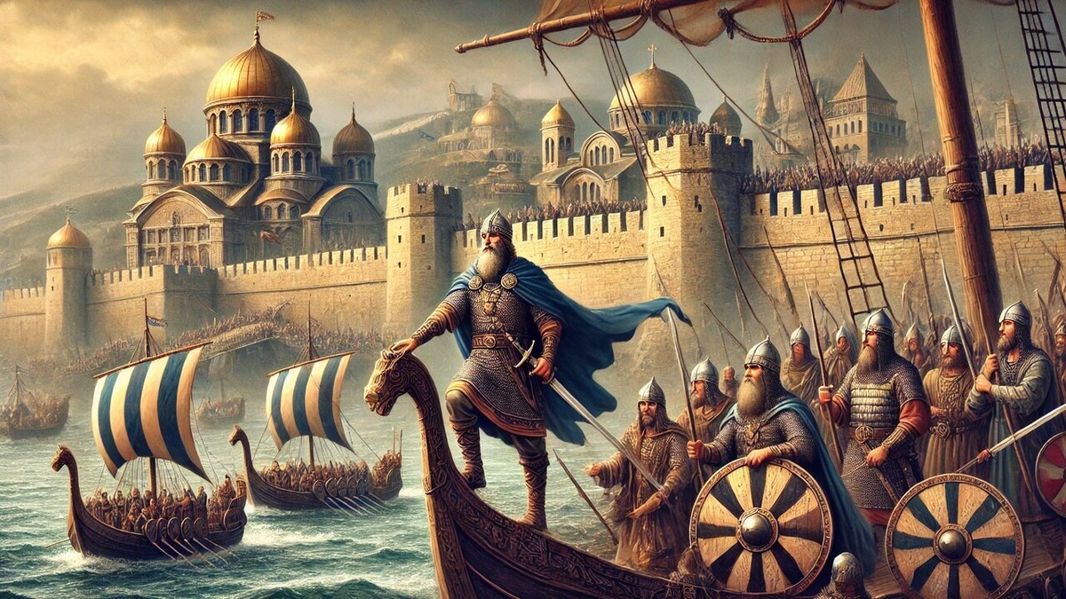 В древние времена, когда Русь только начинала крепнуть, князь Олег Вещий задумал великий поход на Царьград (Константинополь) — столицу могучей Византийской империи. Греки считали себя непобедимыми, их город защищали высокие стены и «греческий огонь» — страшное оружие, пылающее даже на воде. Но Олег был хитер и смел. В 907 году он собрал огромное войско — не только дружину, но и варягов, и даже племена славян. Флот его состоял из двух тысяч ладей! Когда русы подошли к Царьграду, греки перекрыли залив цепями, чтобы корабли не могли пройти. Тогда Олег приказал воинам поставить ладьи на колеса. Подняв паруса, они двинулись по суше прямо к стенам города! Увидев, что корабли идут по земле, как по морю, византийцы пришли в ужас. Они решили, что князь Олег — колдун или сам дьявол, и поспешили предложить мир. Но хитрый Олег потребовал дань не только золотом и шелками, но и необычную плату: греки должны были прислать ему паруса из шелка и золотые цепи — в насмешку над их попыткой запереть гавань