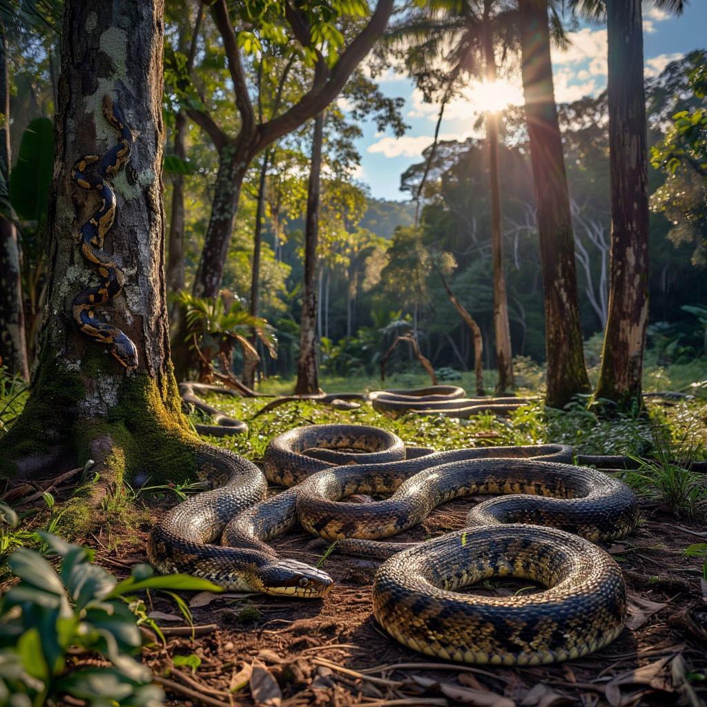 Если сетчатый питон — рекордсмен по длине, то Eunectes murinus, зелёная анаконда, бесспорно является самой тяжёлой змеёй мира. Эти водные гиганты населяют болота и реки Амазонии, предпочитая охотиться из засады, полностью скрываясь под водой.