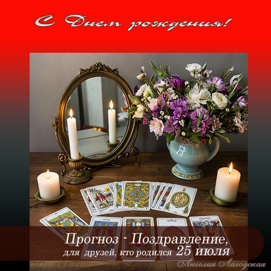 Звёздный привет, дорогой друг! Сегодняшний день —25 июля - ваш день рождения, и подарок-прогноз специально для тебя. (прогноз для моих друзей) Ты родился, и твои звёзды готовят для тебя удивительные сюрпризы и возможности в ближайшие месяцы. Сегодня твой личный прогноз на ближайший год. Результат расклада на картах: В этом году по большей части вы имеете дело сердечными проблемами. Возможно вы будете заняты бизнесом, который связан с многочисленными контактами с людьми, и вам будет нужен успех в проталкивании своих идей и установлении тесного сотрудничества. Вероятно, что ваша роль родителя будет в центре внимания, и вы решите отдавать больше сил ей. На более глубоком уровне вы возможно решитесь на более зрелую и ответственную роль при проявлении своих эмоций. Возможно вы будете расчищать завалы прошлого, которые мешают вашему сегодняшнему счастью. В любом случае эти изменения, которых вы жаждете потребуют от вас определенной решительности. Вам придется что-то в себе изменить и возмо