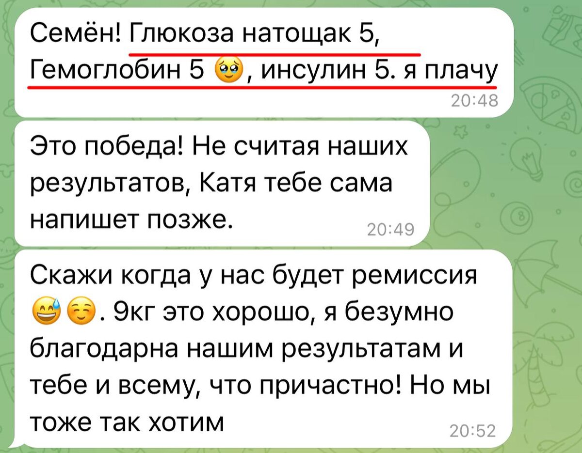 Диабет ушел раз! 3 месяца назад ко мне обратилась семья. Диабет у всех. Папа, мама, дочь. Дочери 18 лет, про диабет узнали пол года назад. Сколько он был - не понятно. По симптомам ~ пол года. Врачи не давали никаких внятных действий, а точнее лечение было полностью противоречивым и для меня это был шок, что им там предлагали Все ссылалось к одному - чем больше таблеток, и чем они дороже - тем лучше. Тем не менее никаких подвижек не происходило. В итоге я взял их в личное ведение. 3 месяца и первый человечек - освобождён от заболевания, которое мучает людей до конца дней! А у родителей Энергии стало х10, уходит лишний вес, уже 9кг на двоих, затуманенное сознание, самочувствие с каждым днем все лучше! ❤️ Связь со мной: @tpxxar Напишите, проведу безоплатную диагностику вам и вашим детям! Быть здоровым просто!