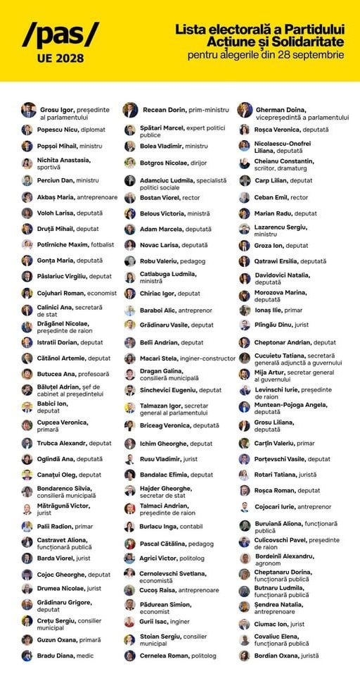 🇲🇩Игорь Гросу опубликовал список PAS на грядущих парламентских выборах: 🗣 "Сегодня на Национальном политическом совете мы проголосовали за список PAS на парламентских выборах 28 сентября. Я благодарю этих людей за то, что они решили внести свой вклад, чтобы Молдова не сбилась с верного пути. Мы объединились, потому что то, что нас объединяет, сильнее того, что нас разъединяет. Люди из сферы здравоохранения, образования, спорта, культуры, бизнеса, сельского хозяйства, государственной службы, дипломаты, представители местной власти, молдаване из диаспоры – мы объединились, отдав всё лучшее, что у нас есть, ради победы Молдовы!" - написал Гросу. @eNewsmd.online