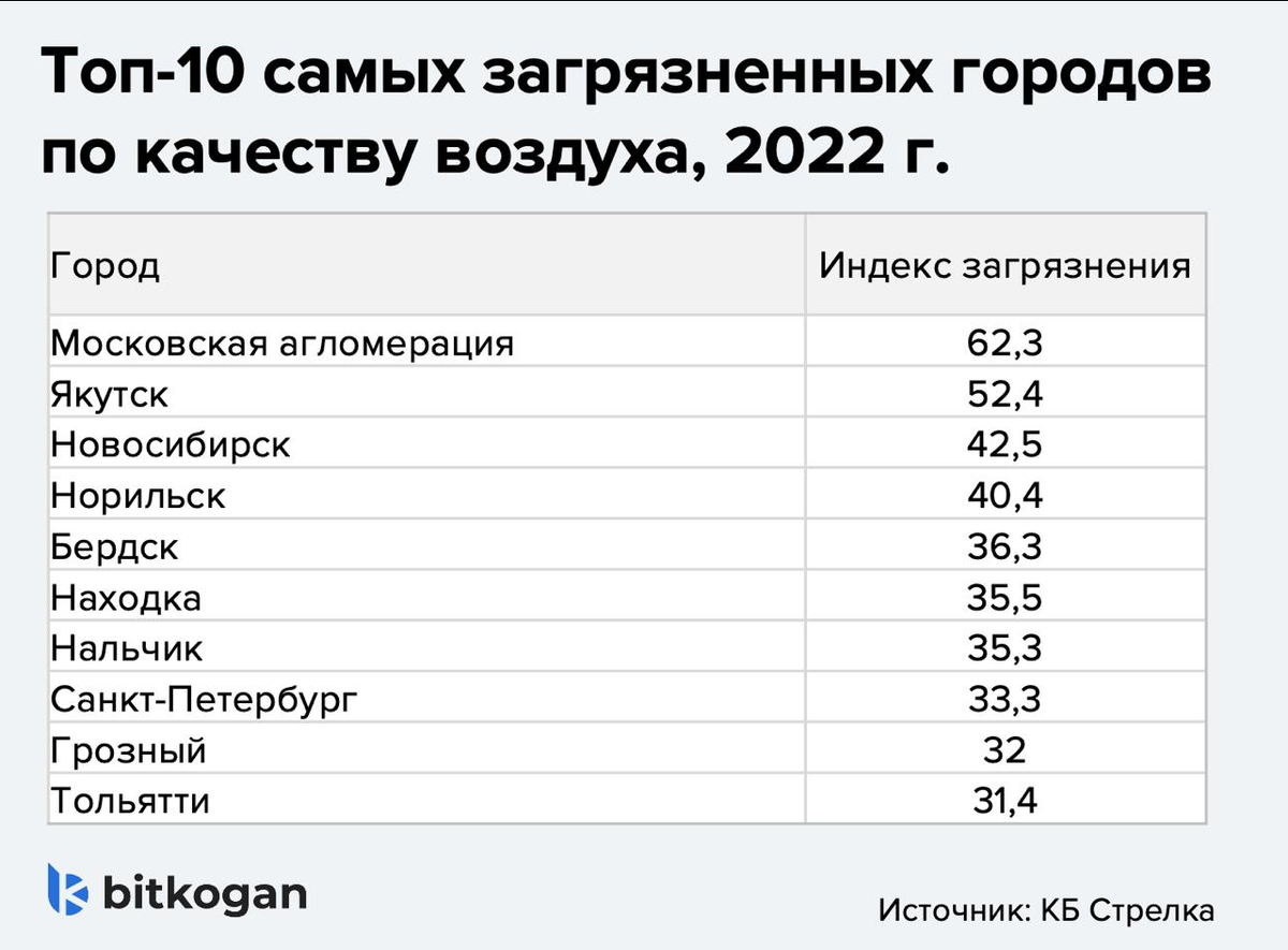 Ни у кого не вызывает сомнения, что загрязнение воздуха влияет на здоровье и качество жизни. Но вот что интересно: у загрязнённого воздуха есть и негативные экономические последствия. Свежее исследование OECD показало, что ухудшение качества воздуха приводит к снижению производительности труда. Причем эффект существенный. По модельным оценкам, треть (!) роста производительности труда в Европе за 2011–2022 гг. могла быть связана с улучшением качества воздуха. А у нас как? Увы, далеко не во всех городах России можно говорить о чистом воздухе. Наиболее загрязненные города приведены в таблице. Рейтинги, конечно, могут быть разными. Все зависит от источников и выбранных периодов времени. В частности, по данным Росгидромета за 2024 год, в числе городов с особенно грязным воздухом оказались Ростов-на-Дону, Красноярск, Махачкала, Ижевск, Нижний Тагил, Новокузнецк, Курск, Томск, Улан-Удэ, Чита. Городов, к сожалению, много. Итог? Некоторые лоббисты любят говорить, что экологические нормы вредят