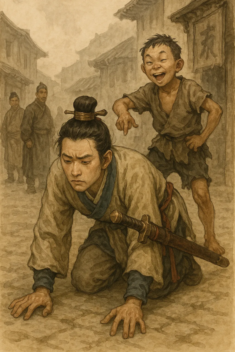 После короткого колебания Хань Синь молча опустился на колени и прополз между ног оборванца на глазах у ошеломлённой толпы.