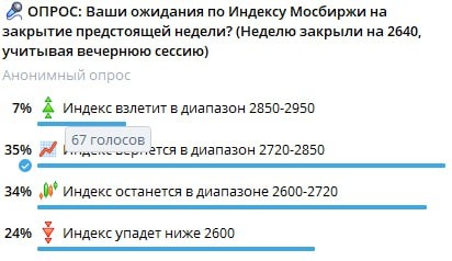 🎤 На прошлой неделе было 3 опроса! Проверим, кто оказался Вангой: 1️⃣ Опрос про ожидания по Индексу Мосбиржи! Неделю закрыли на уровне 2796, сделав за неделю +156 пунктов! 35% - ВАНГИ! Это самый популярный ответ! Рад, что в момент максимальной паники большинство верило в отскок. На втором месте был результат в 34%, ожидавших, что индекс останется в боковике. 24% ждали индекс ниже 2600, что говорило о сильной апатии в момента падения индекса! 2️⃣Опрос по паре юань-рубль! Юань-рубль закрылся на уровне 10,93, то есть три недели подряд неделя закрывается на одноми том же значении! А это значит, что 50% - Ванги! За вариант "ниже 10,84" суммарно голосовало 23%, то есть пессимизм остается высоким, но немного спадает. 3️⃣Опрос по ставке ЦБ! Решение ЦБ примет уже в пятницу! 51% ожидают снижение на 2%, 32% -на 1%, 8% ожидают снижение на 3% и более! Вакансия стать Вангой в этом опросе открыта до пятницы. 🚗 МОЛОДЦЫ! Проведем несколько опросов с ожиданиями на следующую неделю!